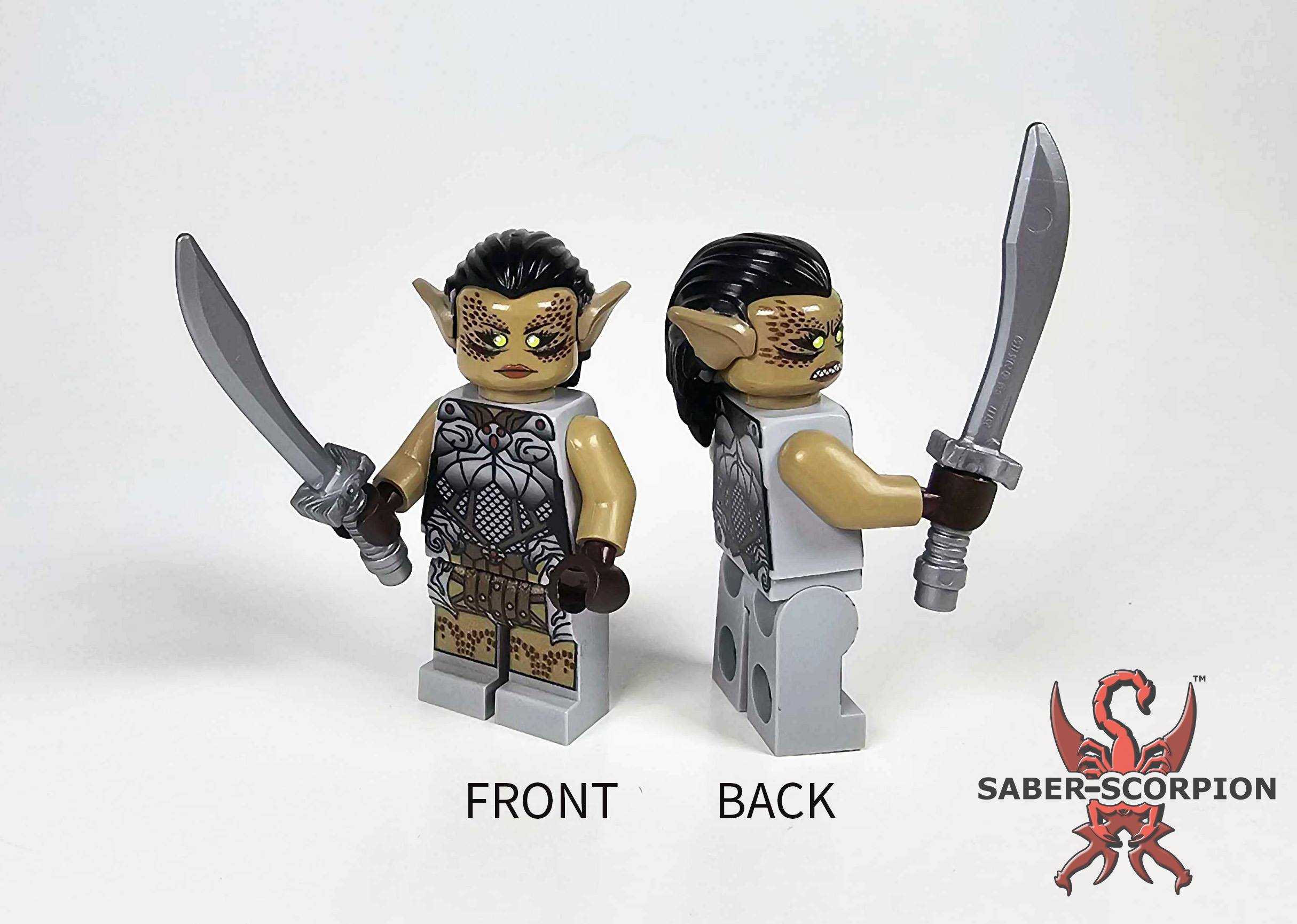 This custom fantasy dungeoneer Gatekeeper Goblin Girl minifig comes with UV printed custom head, torso, and legs, plus hair piece and weapon! NOTE: Some parts, such as weapon and hair, may vary slightly from those seen in photo, depending on what we have in stock.