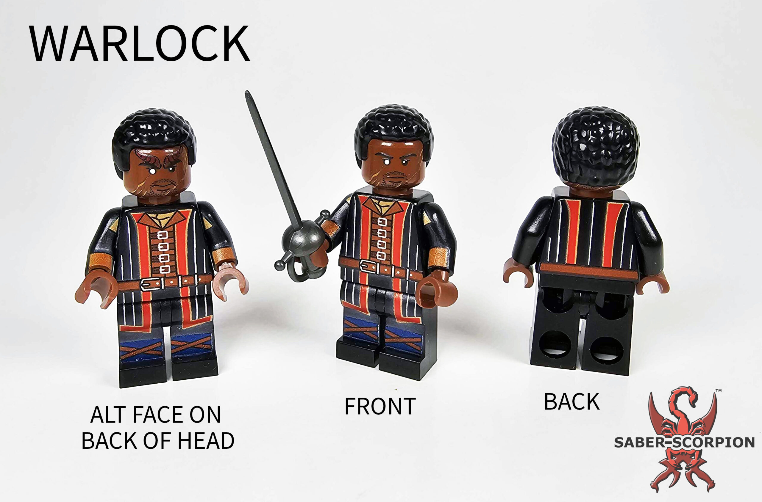 This custom fantasy dungeoneer Gatekeeper Warlock minifig comes with UV printed custom head, torso, and legs, plus hair piece and weapon! NOTE: Some parts, such as weapon and hair, may vary slightly from those seen in photo, depending on what we have in stock.